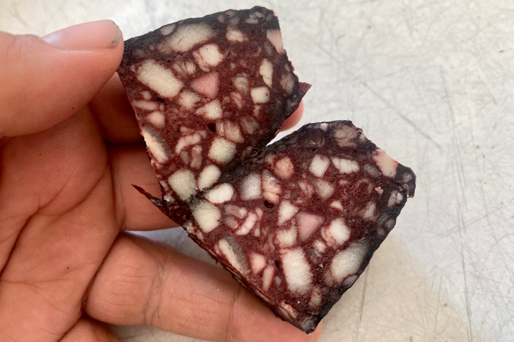 That Colour actually comes from the main Ingredient of the Sausage we call Schwarzwurst. It is also known as Rotwurst in other Areas.
