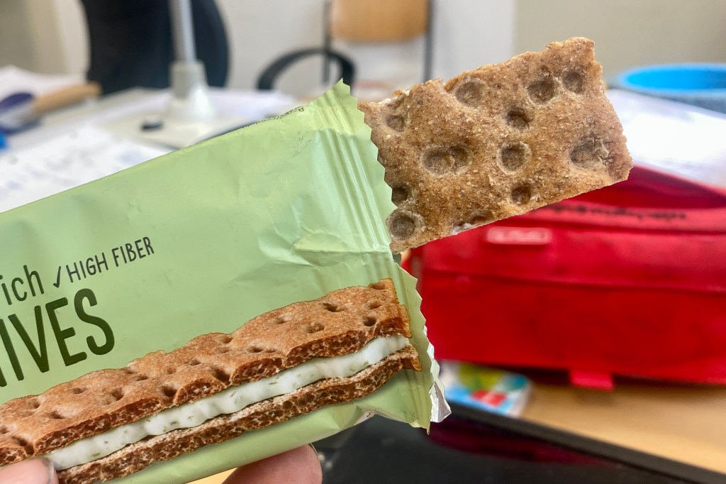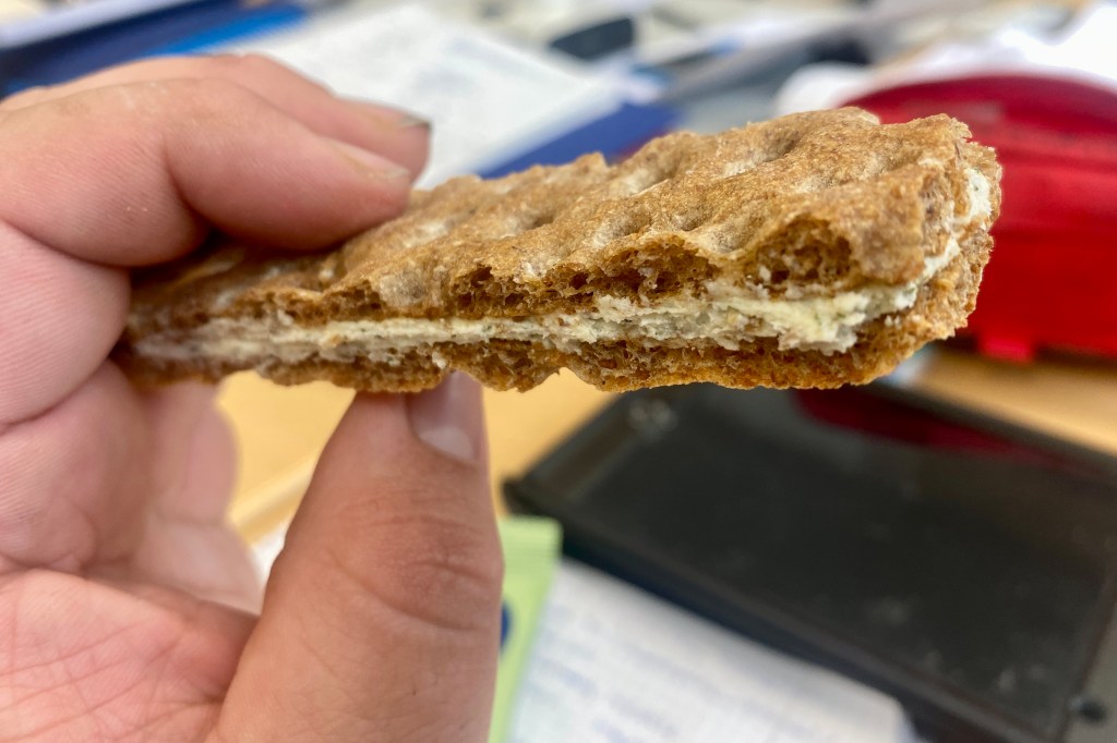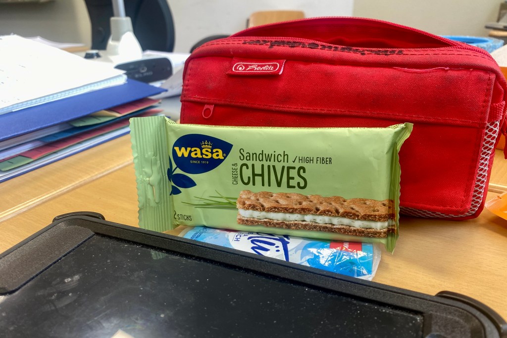 It is a very simple, yet uber practical and very delicious Treat consisting of two slabs of Knäckebröd with a layer of Cream Cheese in between.