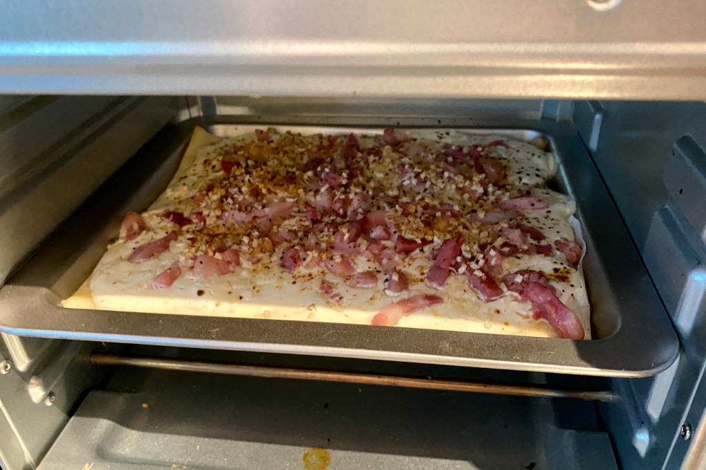 Because my Oven is very tiny and not that powerful at all, it took a long Time to actually cook that Flammkuchen still.