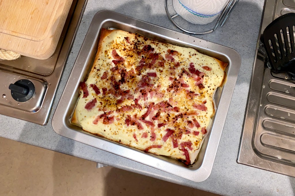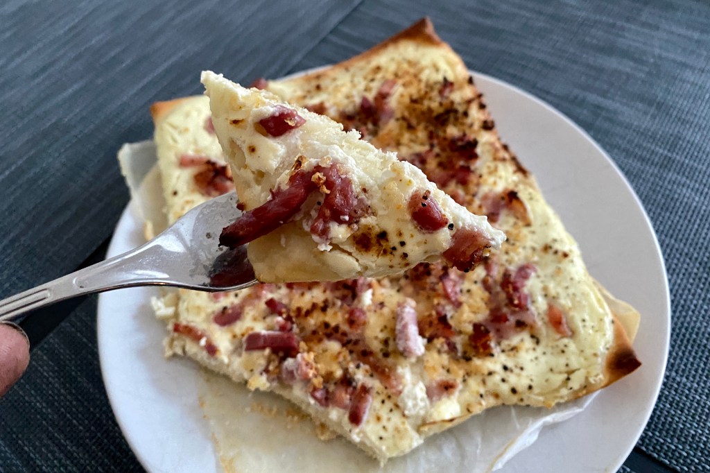 It is pretty much just a Pizza with Crème Fraîche, Onions and Bacon Bits instead of the usual Toppings.