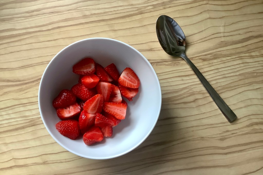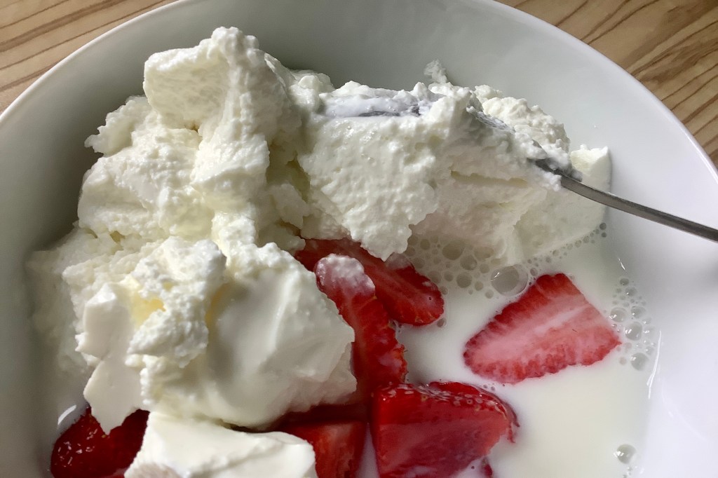 Luckily, on Day two, I got some Strawberries and some Quark. I knew what to do with those two Things, along with some Milk and a light dusting of Sugar right away.